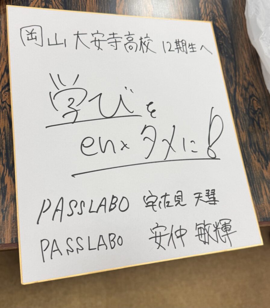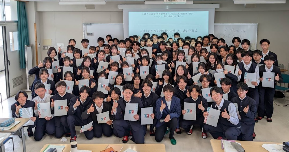 2026年3月24日(火)。岡山県立岡山大安寺中等教育学校の新高校3年生に向け、宇佐見と安仲が数学講義を行った。